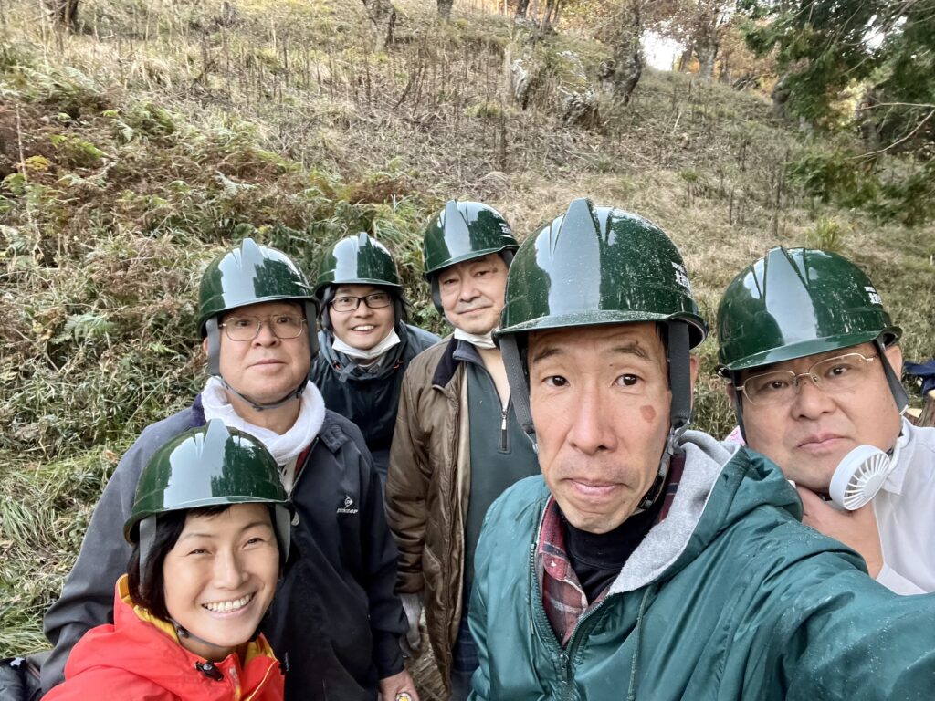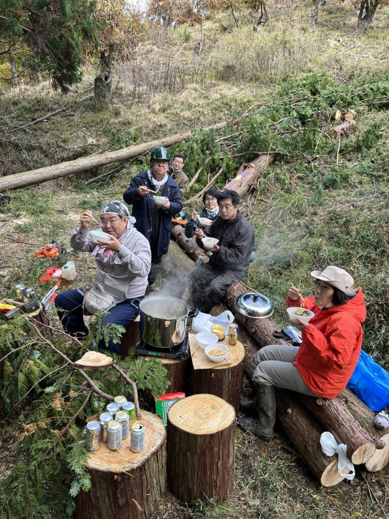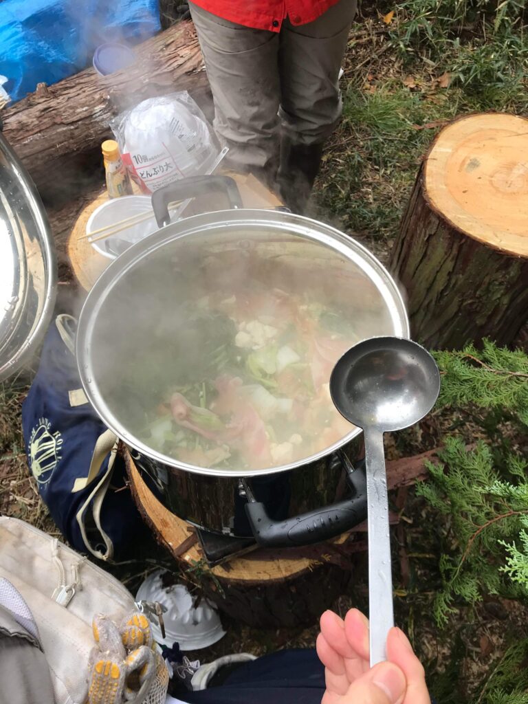 作業の合間に里山で食べるお鍋はサイコーです。