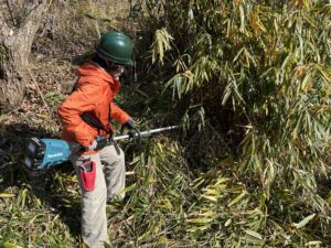 ミヤケくんが大学の学生グループで取り組んでいる里山整備で、道を歩きやすくするために枝を使いたいとのことです。