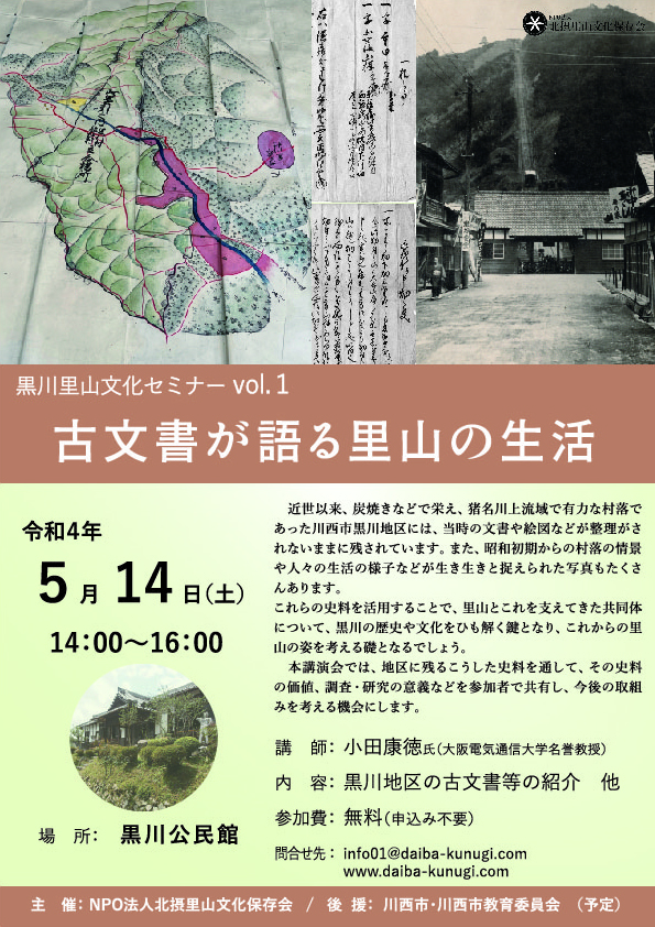 これらの史料を調査・研究することにより、里山とこれを支えてきた共同体としての黒川の歴史や文化などが明らかになることが期待されていることから、講演会を開催して史料の存在や価値、調査・研究の意義などを参加者で共有し、今後の取組みを考える機会とします。