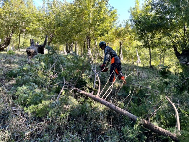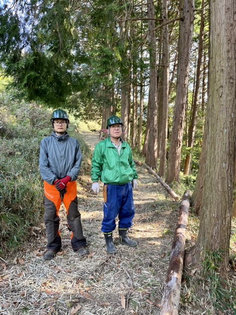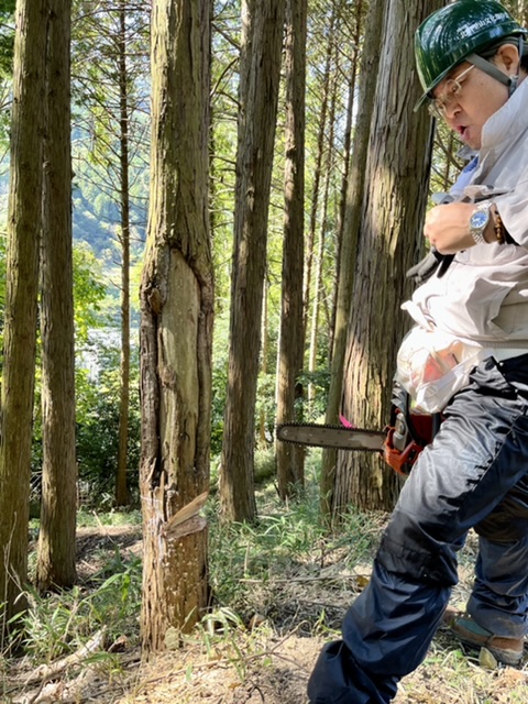 この日の活動のメインは、後ろに見えているヒノキの伐倒です。