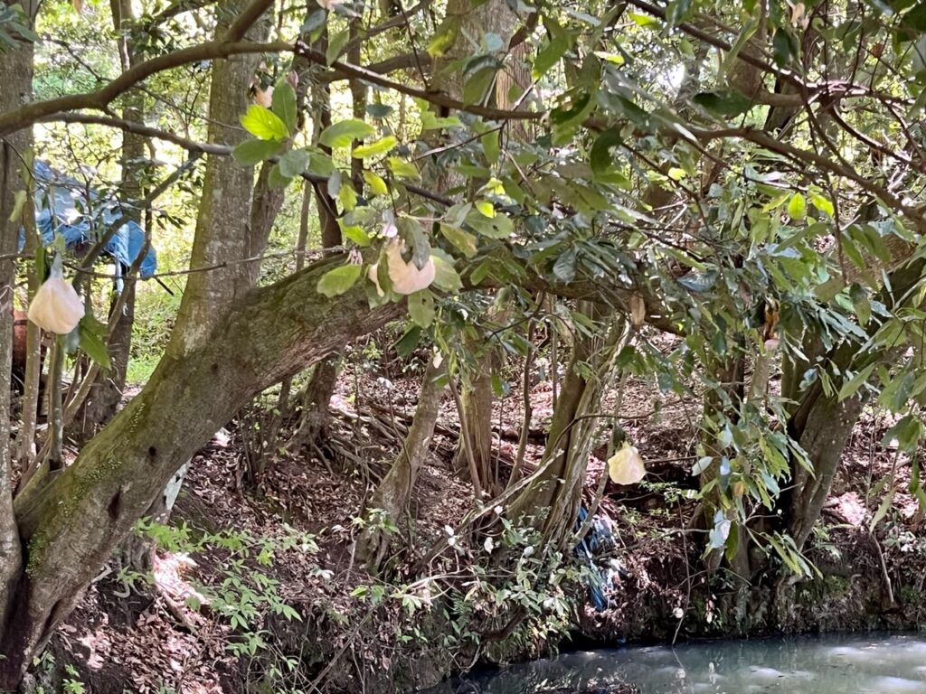 保存会・里山整備隊の定例活動は毎月第3日曜日ですが、シノダ隊長から「3月に植えたクヌギの苗木まわりが草ボーボーやで」と連絡が入り、6月4日(日)に緊急活動を行いました。