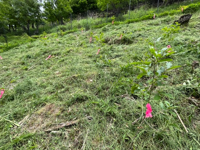 ピンクのテープを巻いたくぬぎの苗木を間違って切らないように慎重に