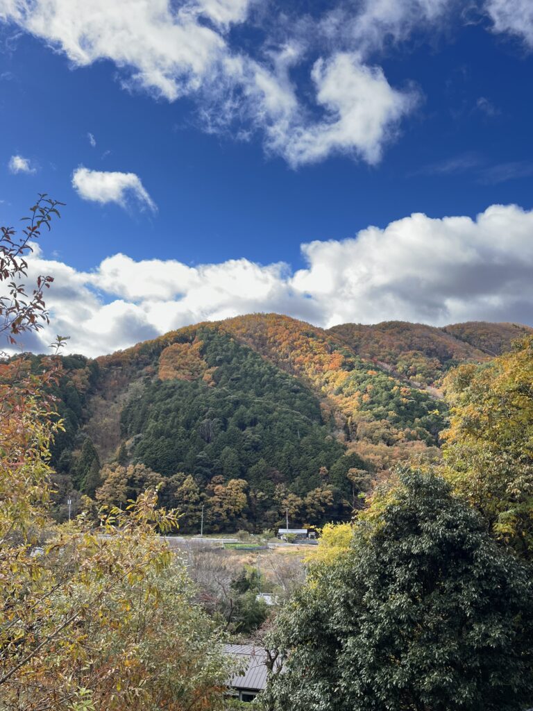 今年は紅葉の訪れが遅かったけど、ようやく山が赤・黄・緑に色付いてパッチワークの様です。