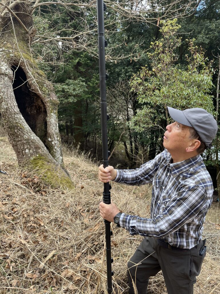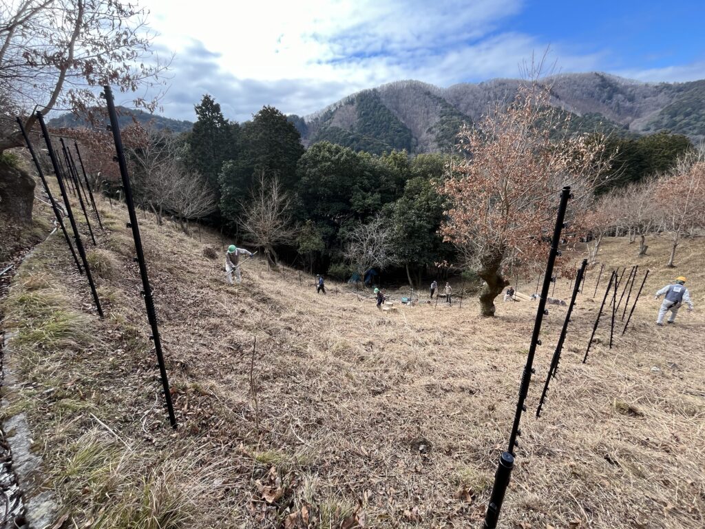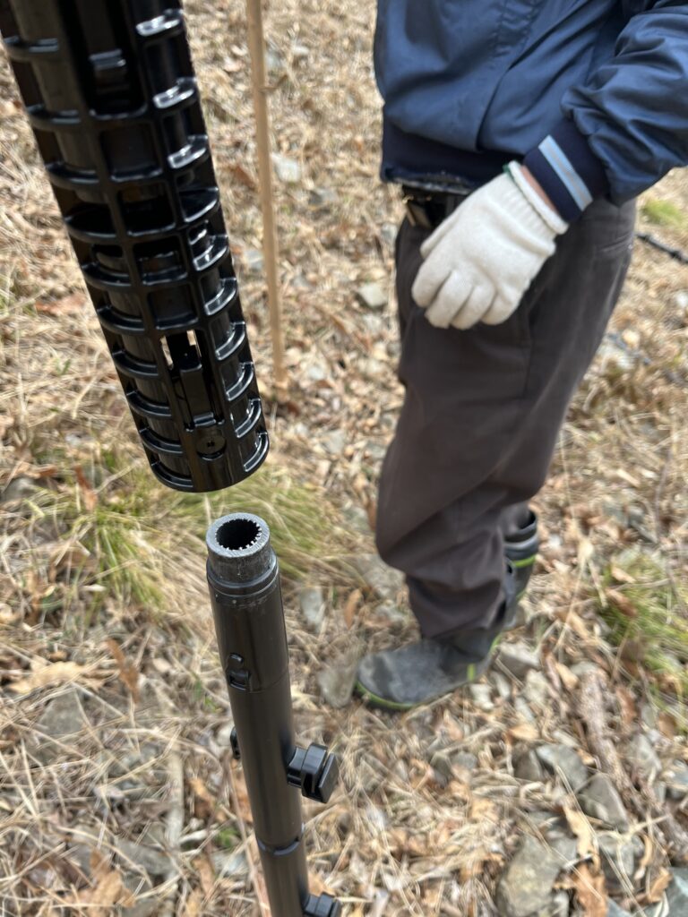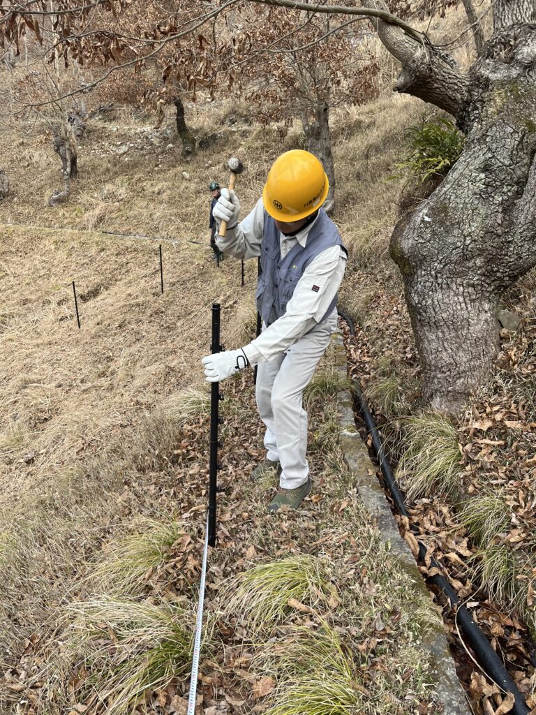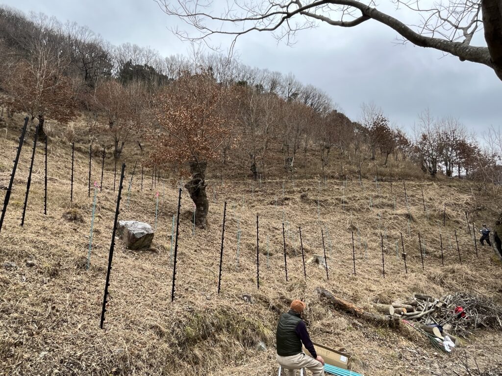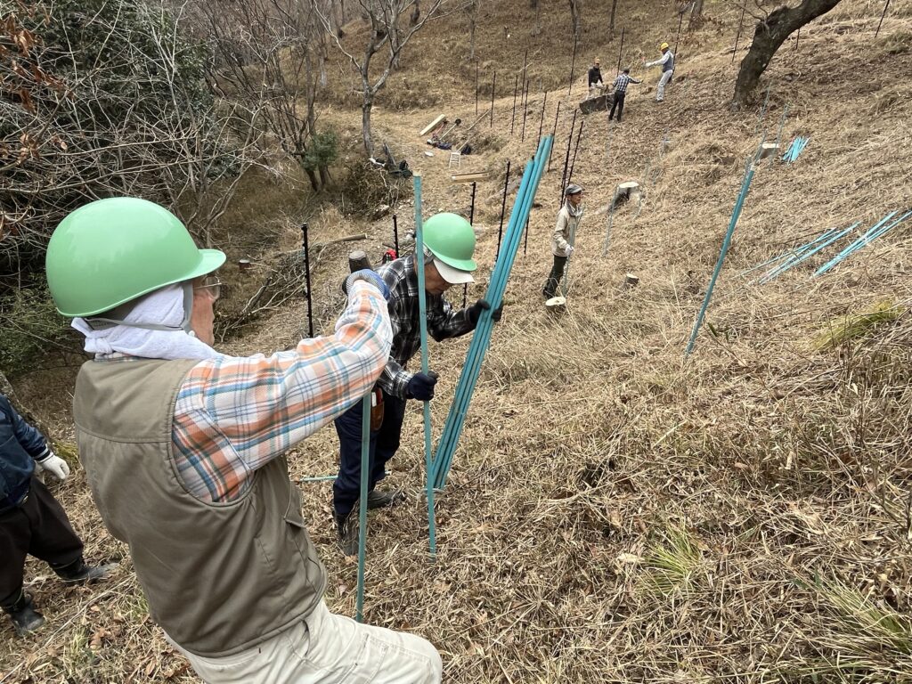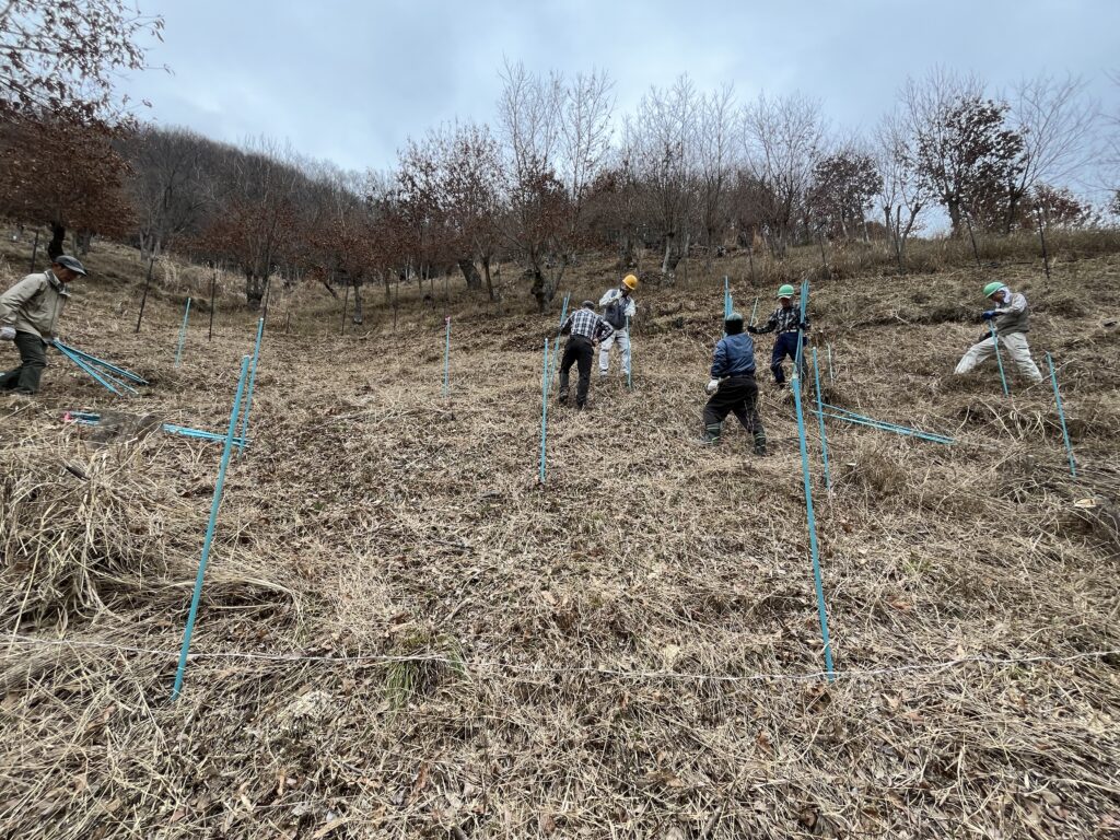 この日は植樹予定地の周りに張る鹿よけのネットの支柱を約50本立てました。