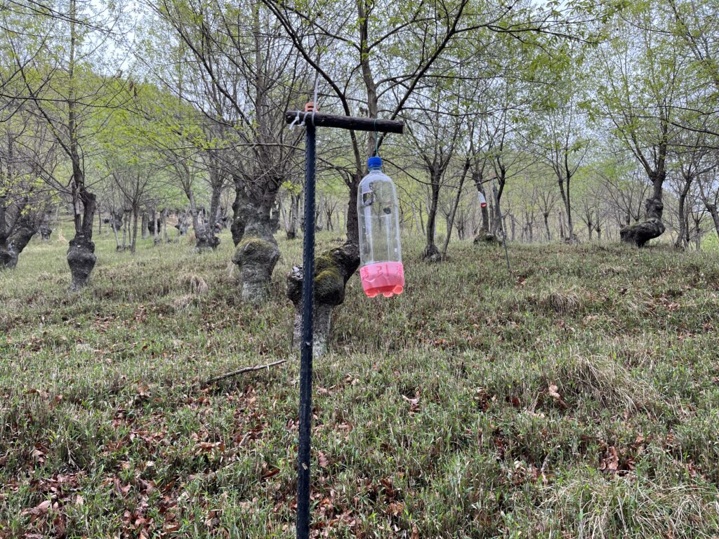 ペットボトルに侵入口を開け、中に焼酎やブドウジュースをベースにした特製のスズメバチジュースを入れて、支柱や枝にぶら下げました。