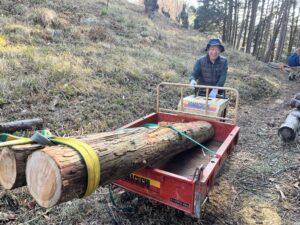 この日はヒノキの丸太3本(L=1.9m)を山から下ろしました。